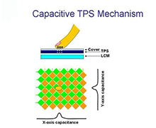 電容式觸控面板在結構上最外層為一薄薄的二氧化硅硬化處理層,第二層為ITO薄膜,這兩片具備特定透明導電圖型的透明薄片,互相不導通,當使用者手指接近面板時,分別負責感應X軸及Y軸的電容變化,并經由控制電路以序列或平行的方式,讀取手指觸摸面板的位置。面板的最下層還有一層ITO薄膜,提供遮蔽功能,以維持Touch Panel能在良好無干擾的環境下工作。
