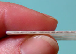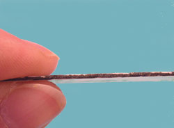 第一張圖片是PMC編織材料用40-PSI的空氣作為輔助氣體切割的情況,切邊處有輕微的碳化現(xiàn)象,這是典型的化學(xué)降解切割法造成的,激光能量將材料降解并被輔助氣體清除。由于這個(gè)應(yīng)用中切邊的質(zhì)量非常重要,因此我們將輔助氣體換成高壓氮?dú)狻T诘诙眻D片中我們可以看到,高壓氮?dú)?180 PSI)能顯著減少PMC材料切邊的碳化。