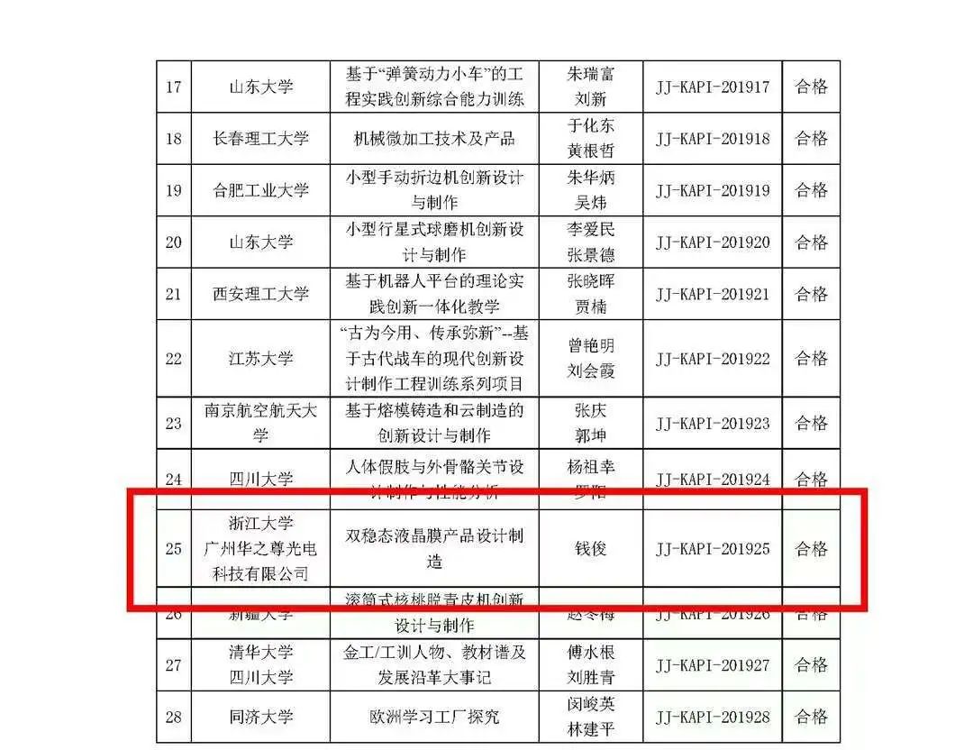 經教育部機械基礎課程教學指導分委員會研究決定,于2022年1月對 2019KAPI一體化培養方法教學研究項目進行結題驗收。經過專家組對提交的教學研究項目結題資料進行審查和評審,同時經教指委審核批準。浙江大學和廣州華之尊光電科技有限公司的KAPI一體化培養項目“激光精密加工與新材料、新技術、新工藝的綜合應用實踐—雙穩態液晶膜產品設計制造”順利結題驗收。