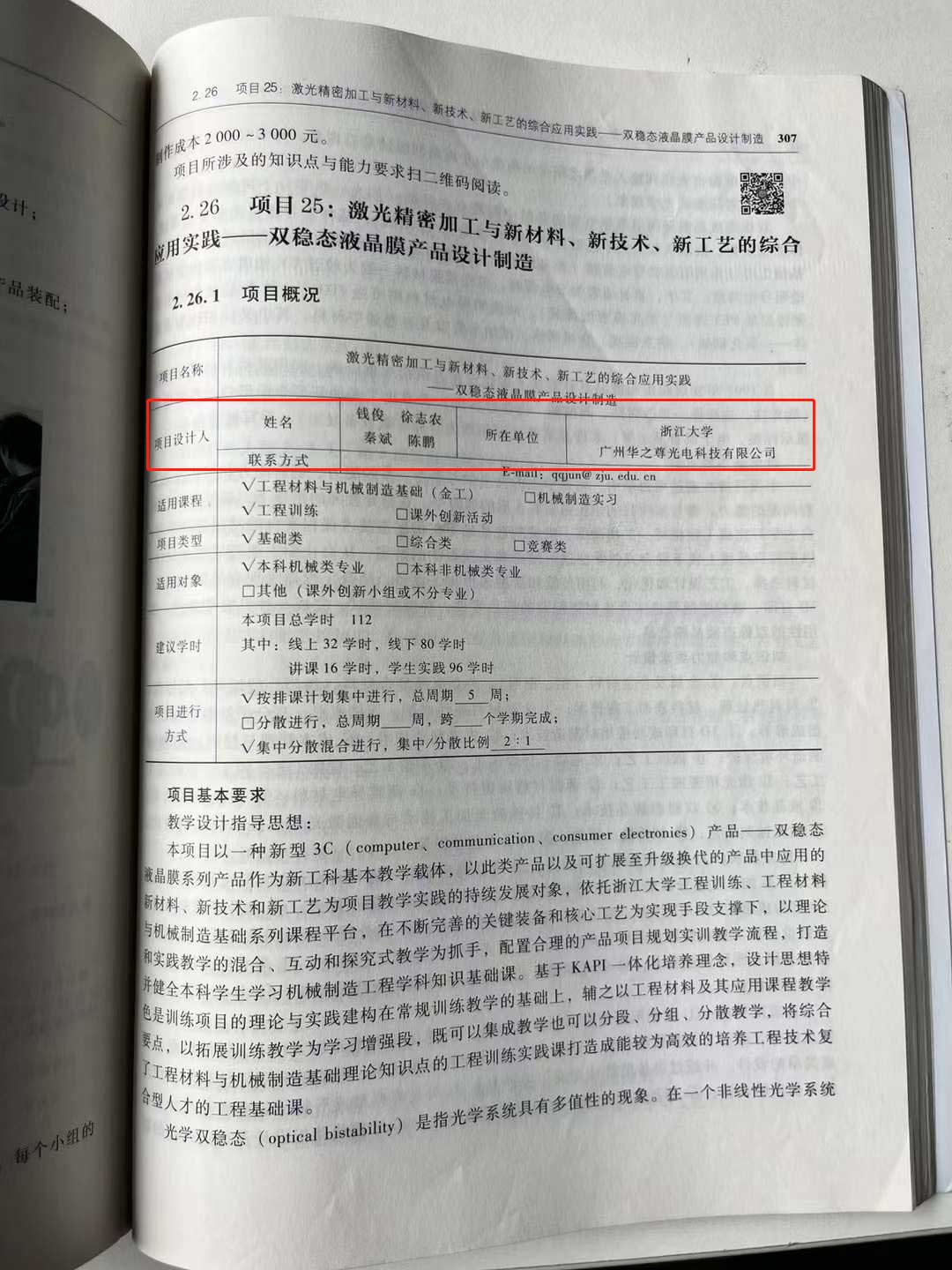 激光精密加工與新材料、新技術、新工藝的綜合應用實踐—雙穩態液晶膜產品設計制造項目是由浙江大學和廣州華之尊光電科技有限公司基于新材料、新技術、新工藝共同推出的新型教材。項目以新型3C產品一雙穩態液晶膜系列產品作為新工科基本教學教體,項目依托浙江大學工程訓練、工程材料與機械制造基礎系列課程平臺,在不斷完善的關鍵裝備和核心工藝為實現手段支撐下,以理論和實踐教學的混合、互動和探究式教學為抓手,配置合理的產品項目規劃實訓教學流程,打造并健全本科學生學習機械制造工程學科知識基礎課。基于KAPI一體化培養理念,設計思想特色是訓練項目的理論與實踐建構在常規訓練教學的基礎上,輔之以工程材料及其應用課程教學要點,以拓展訓練教學為學習增強段,既可以集成教學也可以分段、分組、分散教學,將綜合了工程材料與機械制造基礎理論知識點的工程訓練實踐課打造成能較為高效的培養工程技術復合型人才的工程基礎課。