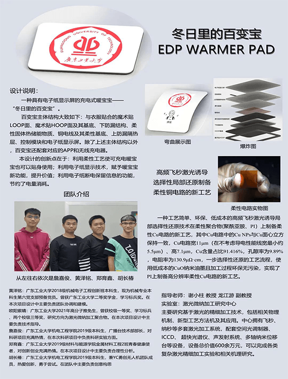 此作品一種具有電子紙顯示屏的充電式暖寶寶。利用柔性電路工藝、電子紙顯示技術、利用了電子紙斷點保留信息的特點。