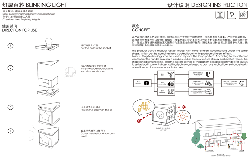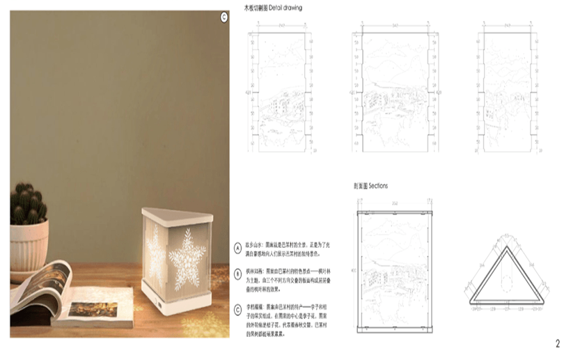 設計說明:四塊亞克力板上刻有標牌、農家、房屋和山水畫等元素。線條勾勒出農民和別墅,反映出簡單的鄉村生活。鄰里相見,表現出和諧美好的人際關系。山脈、河流代表了寧靜舒適的鄉村生活。根據自身的文化傳統和農村的實際需要,探索鄉村振興之路。