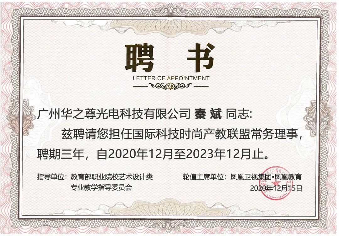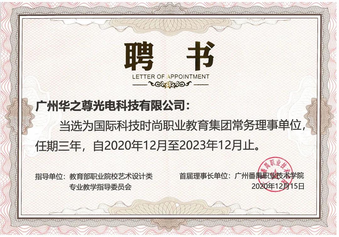 教育向善,共生未來!世界因你而溫暖!廣州華之尊光電科技有限公司榮獲國際科技時尚職業教育集團常務理事單位。華之尊激光秦斌總經理榮獲“雙高”建設項目——廣州番禺職業技術學院設計專業群建設指導委員會委員、國際科技時尚產教聯盟商務理事。
