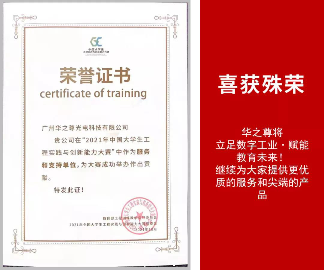 ● 華之尊很榮幸能成為本次大賽指定的服務和支持單位,為了解決學生激光加工環節的問題,我們提供了目前工業制造與各大高校常用的一款精密型HZZ-V4000激光切割雕刻一體機,它的有效工作幅面達到1000mm*600mm,運用數位式功率控制,可由0.1—100%無段控制,且可依圖形成比例的控制脈波產生速度,同時可依圖形顏色設定不同功率。采用5G加速度,最大速度達到3600m/s,大大提高了工作效率,一鍵式打印輸出,無需轉換,避免圖形在轉化過程中失真,從而使產品精度得到更高保證,操作就是這么方便簡單!
