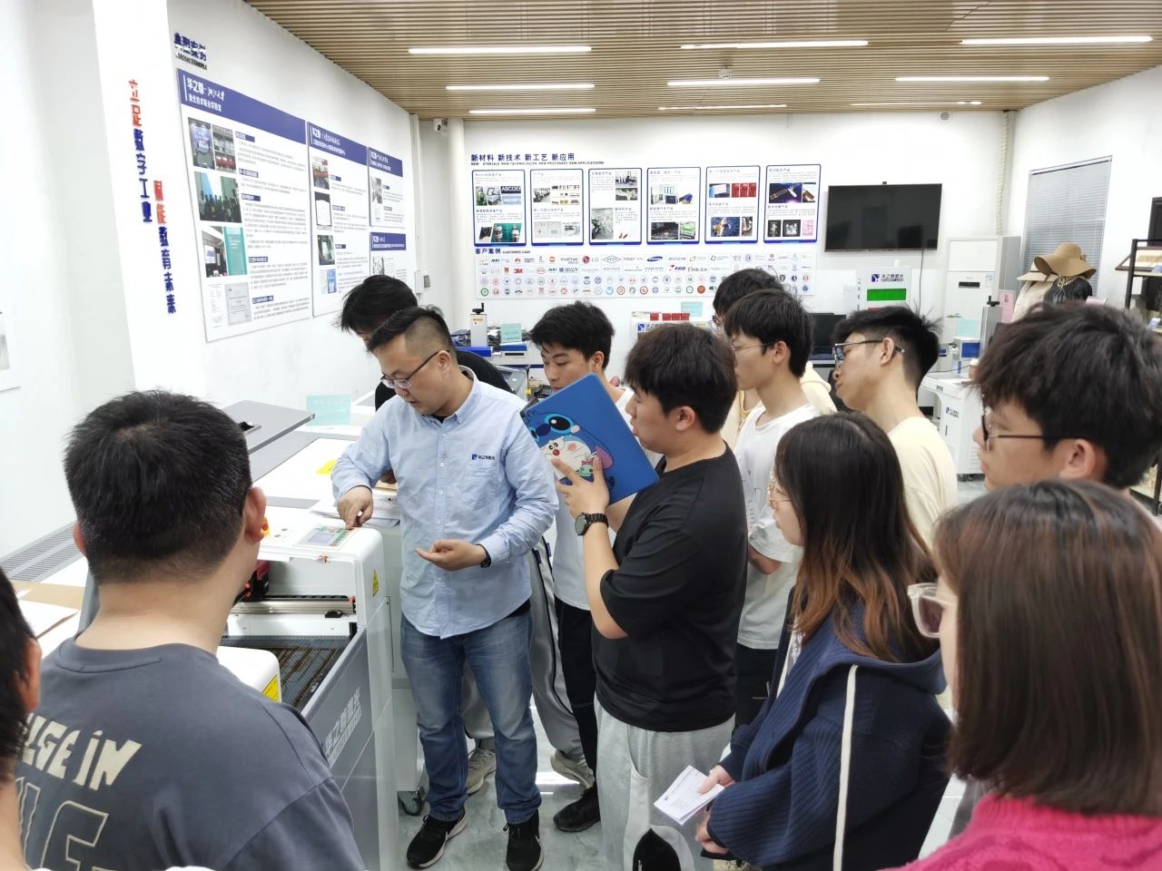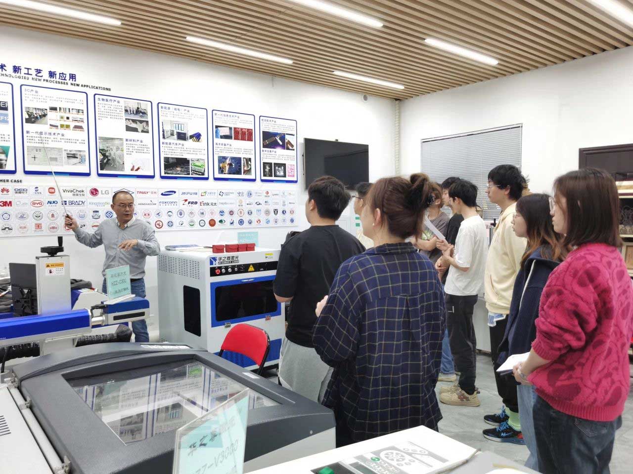 為了讓學生們更好地了解激光行業的發展趨勢,華之尊激光總經理·秦斌帶領學生參觀公司的激光技術應用研究區、設備區、應用作品展示區、新材料·新技術·新工藝·新應用探究區,并為他們做了詳細解說,使學生了解了激光技術的最新應用和行業動態。為后續的設備培訓打下堅實的基礎。